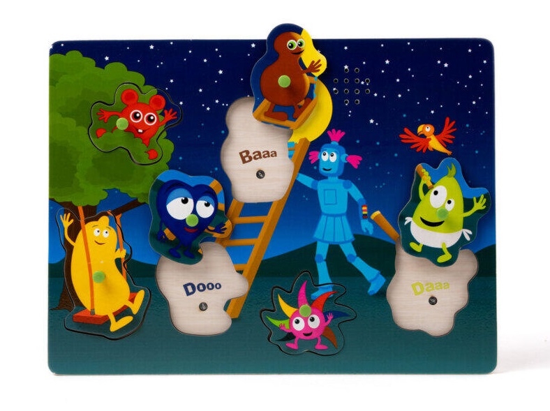 Lær og leg med lyde med det nye Babblarnas lydpuslespil. Babblarna leger ude under træet og kigger på den fine måne. Babblarna lydpuslespil er et pædagogisk træpuslespil, der kombinerer leg med tidlig sprogindlæring. Når barnet placerer brikkerne korrekt, afspilles den tilsvarende lyde fra Babblarna, f. eks. Diddi diddi diiiiii!, når brikken af Diddi sættes i det matchende hul. Dette giver barnet både visuel og auditiv feedback, hvilket styrker forbindelsen mellem lyd og billede. Puslespillet har en afbryder bagpå, så spillet også kan laves uden lyd. Puslespillet måler: 30 × 22,5 cm. Kræver 2 stk. AAA-batterier (medfølger ikke). Fra 10 måneder.