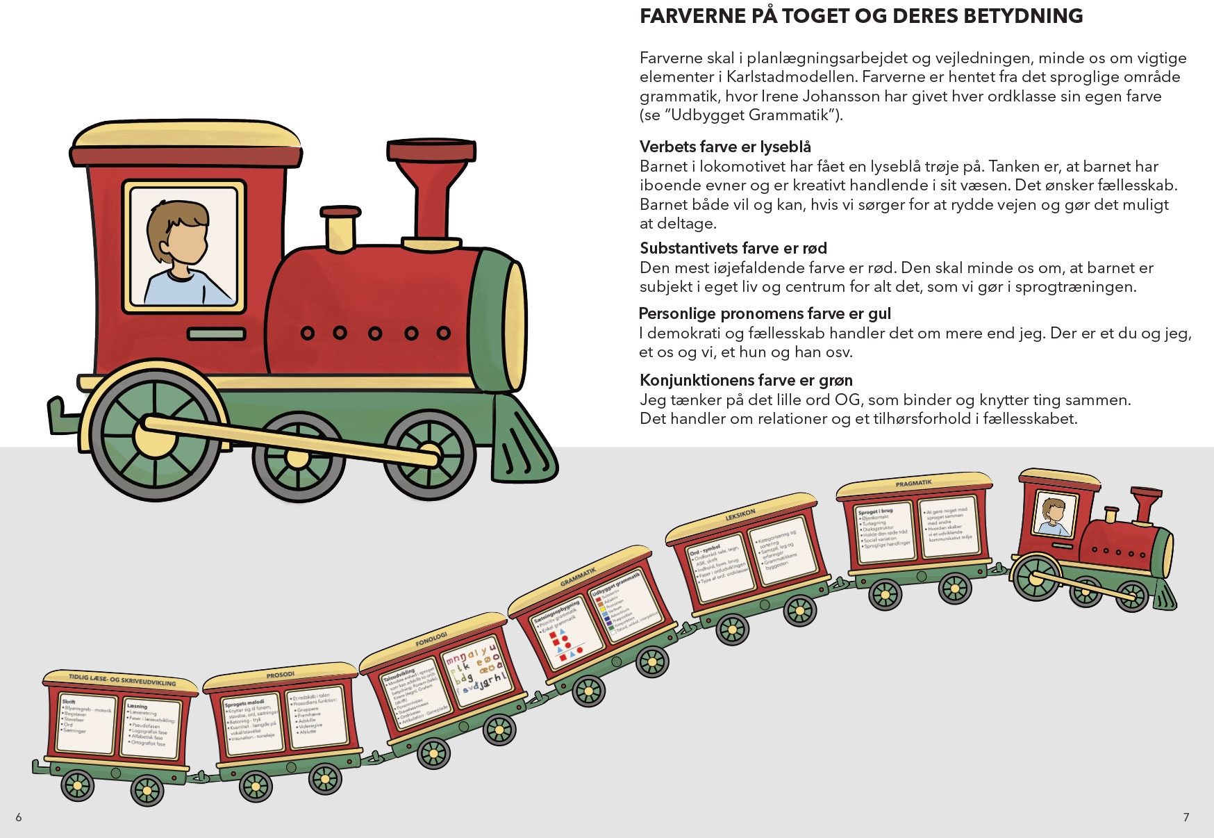 Sprogtoget er et værktøj til planlægning og vejledning af sprogtræning med Karlstadmodellen. Bogen er blevet oversat, bearbejdet og fået opdateret alle illustrationer. Sprogtoget giver en fin og overskuelig oversigt over de sproglige områder, som der arbejdes med i Karlstadmodellen og sprogtræning generelt. Bogen består af 1 lokomotiv og 6 vogne. Lokomotivet repræsenterer barnet og de efterfølgende vogne repræsenterer de forskellige sproglige områder i barnets sproglige udvikling; pragmatik, leksikon, grammatik, fonologi, prosodi og tidlig læse- og skriveudvikling. Bogen giver ingen forslag til materiale og metode, men skal ses som en hjælp i arbejdet med planlægningen af sprogtræningen. Bogen indeholder QR kode til download af Sprogtoget samt Sprogtoget køleskabsversion med og uden tekst.