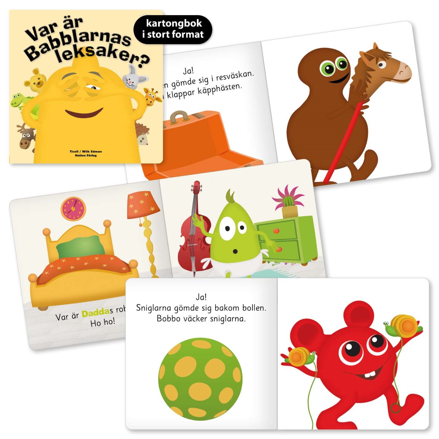 Mens I leder efter Bobbos snegle og resten af Babblarnas legetøj, vil barn opdage og øve sig på vigtige forholdsord som 'under', 'bagved' og 'på'. Bogen giver også mulighed for at øve at tælle. Bobbo har to snegle, Dadda har tre robotter, og hvor mange krammedyr har Bibbi? Tæl sammen og find ud af det!